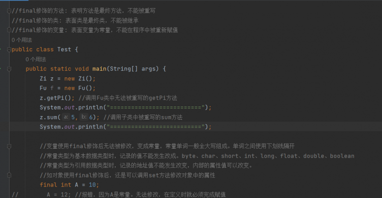 //final修饰的方法: 表明方法是最终方法,不能被重写 //final修饰的类: 表面类是最终类,不能被继承 //final修饰的变量: 表面变量为常量,不能在程序中被重新赋值 public class Test { public static void main(String[] args) { Zi z = new Zi(); Fu f = new Fu(); z.getPi(); //调用Fu类中无法被重写的getPi方法 System.out.println("=========================="); z.sum(5,6); //调用子类中被重写的sum方法 System.out.println("=========================="); //变量使用final修饰后无法被修改,变成常量,常量单词一般全大写组成。单词之间使用下划线隔开 //常量类型为基本数据类型时,记录的值不能发生改成。byte、char、short、int、long、float、double、boolean //常量类型为引用数据类型时,记录的地址值不能发生改变,内部的属性值可以改变。 //如对象使用final修饰后,还是可以调用set方法修改对象中的属性 final int A = 10; // A = 12; //报错,因为A是常量。无法修改,在定义时就必须完成赋值 System.out.println(A); } } class Fu { public final void getPi() { System.out.println("我是被final修饰的getPi方法,位于Fu类中"); System.out.println("3.14159265358979323846"); } public void sum(int a, int b) { System.out.println("我是没被final修饰的sum方法,位于Fu类中"); System.out.println(a+b); } } class Zi extends Fu { //sum方法没有被final修饰,可以被重写 @Override public void sum(int a, int b) { System.out.println("我是没被final修饰的sum方法,位于Zi类中"); System.out.println(a+b); } //getPi方法被final修饰,不能被重写,报错 // @Override // public final void getPi() { // System.out.println("我是被final修饰的getPi方法,位于Fu类中"); // System.out.println("3.14159265358979323846"); // } }